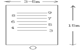 15米长、3-5米宽的平整场地一块(如图),塑胶、土质、水泥地面均可,皮尺1副。测试用球为2Kg实心球。